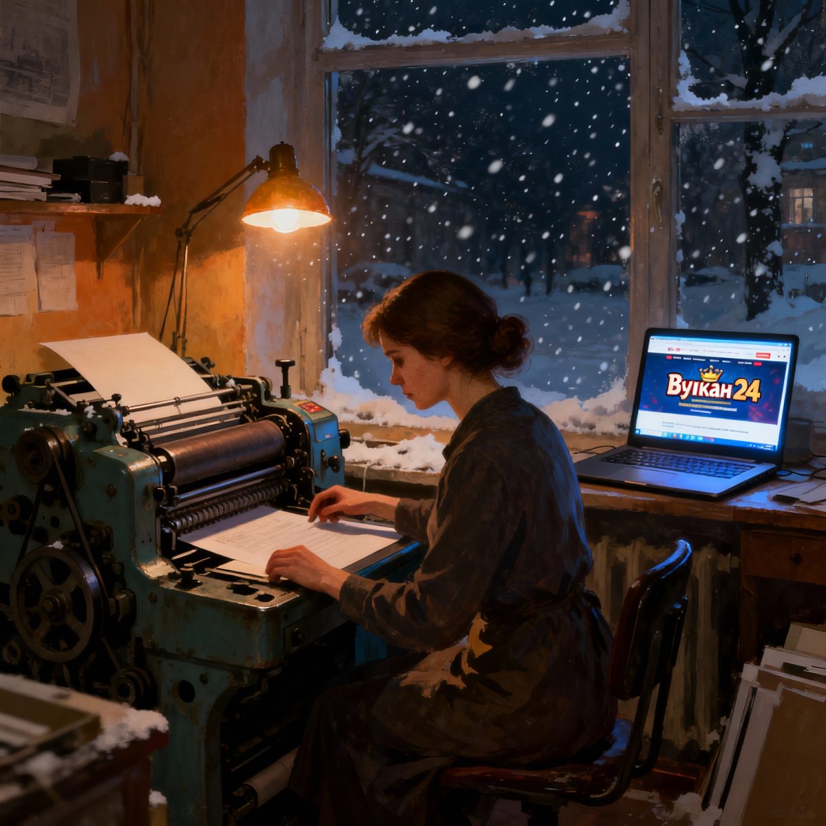 Меня зовут Марта, я ночная машинистка печатной мастерской при библиотеке на окраине города, где окна смотрят в пустырь и снег ложится ровными слоями, как чистые листы перед набором. Бумага у нас шуршит как сухой камыш, а шрифт ложится на листы ровно, будто иней на стекло зимнего трамвая. В эту позднюю смену, когда под потолком гудит вентилятор, в воздухе висит запах свинцовых литер и горячих ламп, я завариваю крепкий чай и сажусь к столу: на экране мерцает официальный сайт Вулкан 24, как вывеска круглосуточной кофейни, которая не закрывается ни в метель, ни в полнолуние.